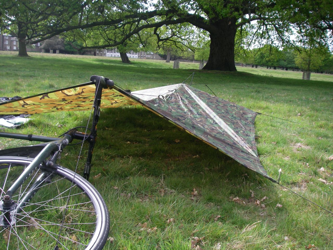 Pretty successful (the funny wrinkle in the side is due to only partly pegging that side in). It’s wide enough to lie under with gear. It’s high enough not to be right in my face. And if I can find co-operative branches or trees, it could be even better. The pole can easily attach to the bike with velcro cable ties, and the same ties can be used to run a guy rope across the bar-ends. Sweet!